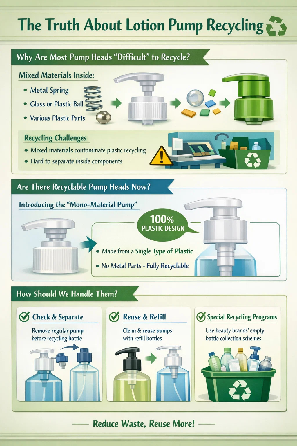 Difficultés du recyclage : Les machines de recyclage ne peuvent généralement traiter qu’un seul matériau. Lorsque ces pompes, qui sont un mélange de métal et de plastique, entrent dans la chaîne de recyclage, les machines ont du mal à les séparer. S'ils ne sont pas séparés, le ressort métallique « contaminera » une grande quantité de plastique pur, et pourra même endommager l'équipement de recyclage.