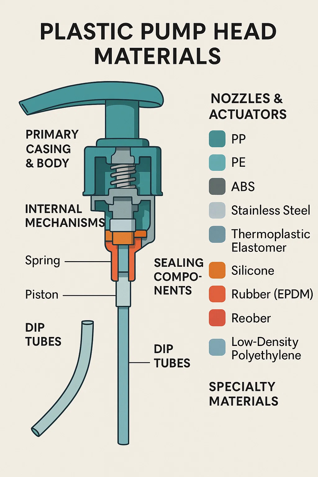 Têtes de pompe en plastique sont construits à partir de plusieurs composants, chacun servant des rôles fonctionnels spécifiques. Voici une ventilation de leur composition matérielle:
