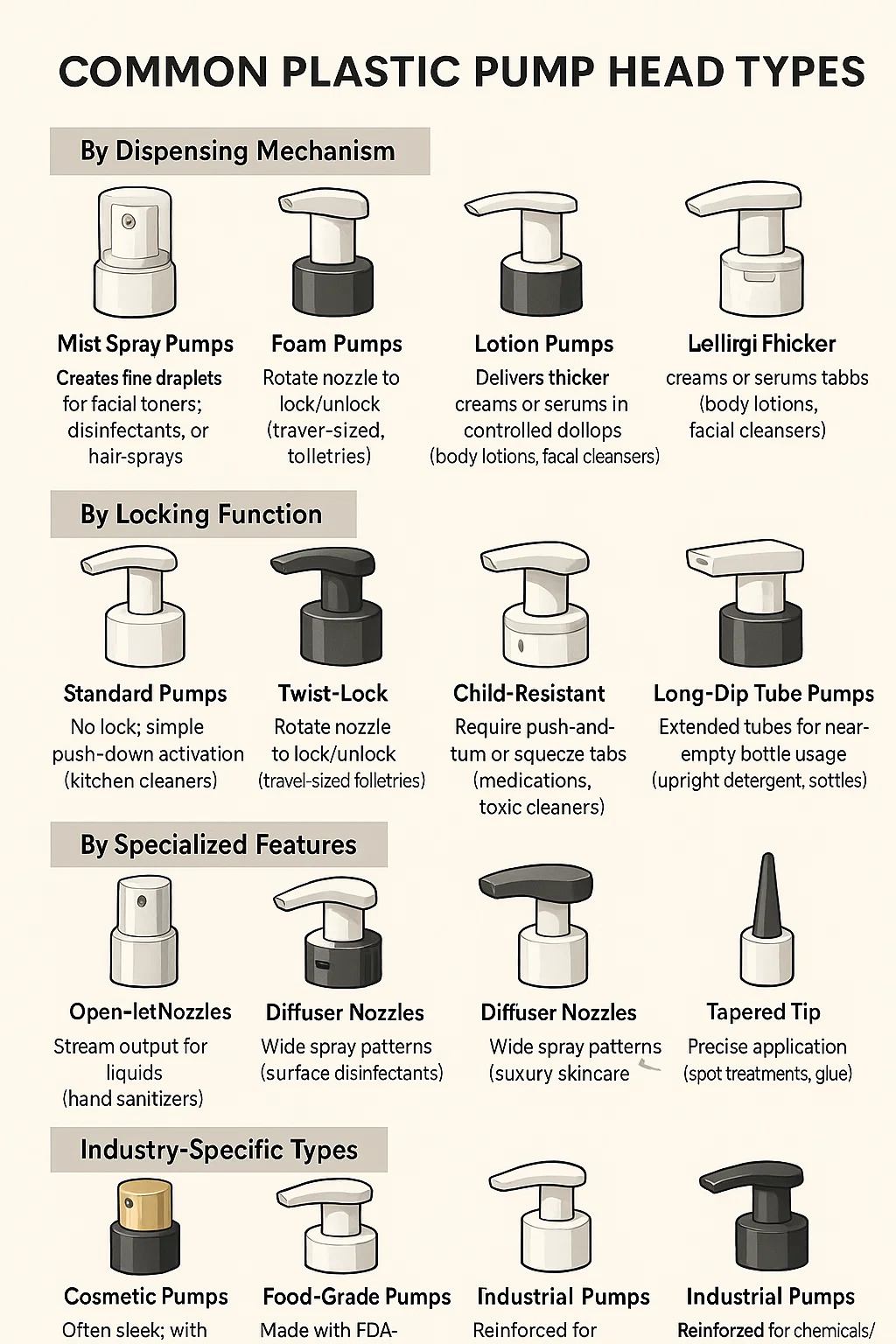 Voici une ventilation de commun tête de pompe en plastique Types basés sur leurs conceptions et applications fonctionnelles: