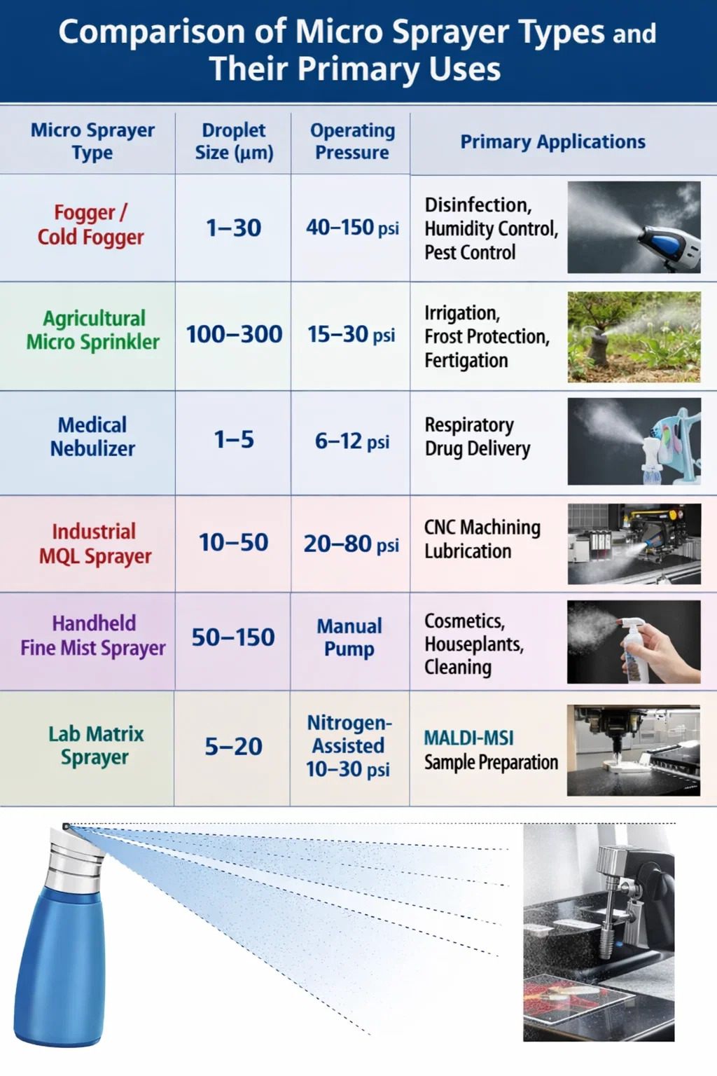 Différentes configurations de micropulvérisateurs sont optimisées pour des applications spécifiques. Choisir le mauvais type entraîne une mauvaise couverture, un gaspillage de matériel ou des dommages matériels. Le tableau ci-dessous résume les types de micropulvérisateurs les plus courants, leurs tailles de gouttelettes typiques, leurs pressions de fonctionnement et les meilleurs cas d'utilisation.