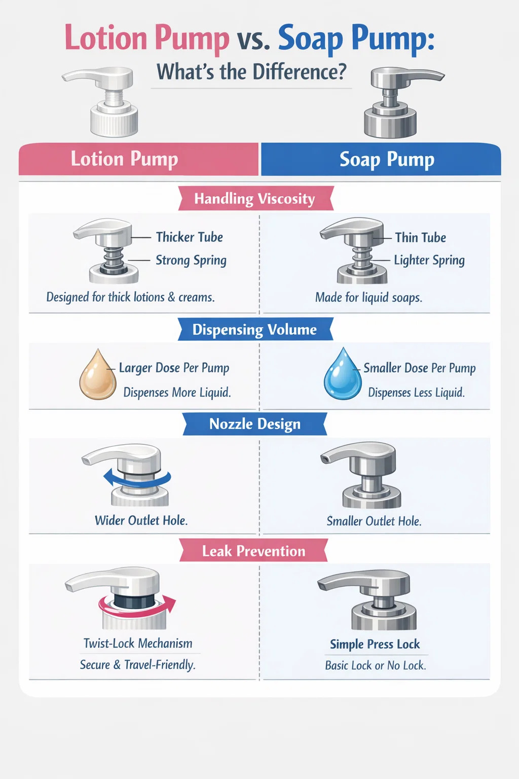 Pompe à savon : Sa cible est généralement du savon pour les mains ou du savon à vaisselle très fluide. Si vous mettez une lotion pour le corps épaisse dans une pompe à savon ordinaire, vous aurez peut-être du mal à appuyer ou elle pourrait ne pas rebondir correctement.