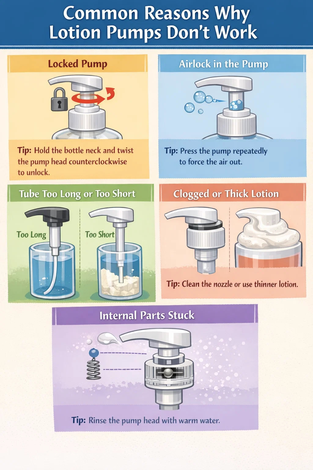 C'est assez frustrant lorsque l'on est confronté à son produit de soin préféré mais que la pompe à lotion refuse de fonctionner. La raison d’un dysfonctionnement de la pompe se cache généralement dans quelques détails discrets.
